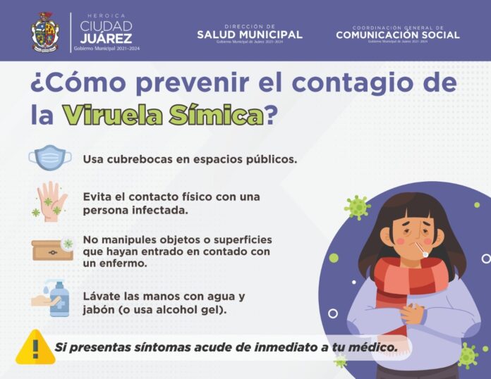 Ciudad Juárez.- Luego de que fueron confirmados dos casos positivos de Viruela Símica en Ciudad Juárez, la Dirección de Salud del Gobierno Municipal exhorta a la comunidad fronteriza a seguir las medidas de bioseguridad necesarias para prevenir el contagio de esta enfermedad.