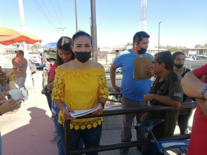 Mayra Valdez, dirigente de Mariposas Amarillas en el Distrito Electoral 02, correspondiente a las colonias ubicadas al norponiente de la ciudad, acudió ante las manifestantes de esta mañana con la intención de platicar con los inconformes, a quienes planteo como posible solución a su problema la adquisición de un tinaco.
