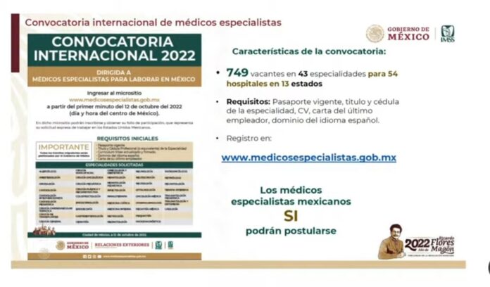 “Es una convocatoria internacional; es decir, está la estamos lanzando para médicos, médicas especialistas de otras partes del mundo que estén interesados en venir a México a trabajar en un período de un año en estos en estos lugares”, indicó.