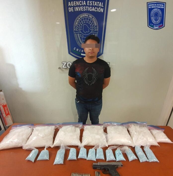 Ciudad Juárez.- Como parte de las labores de investigación efectuadas para el combate y la persecución de los delitos contra la salud; elementos de la Fiscalía General del Estado (FGE) adscritos a la Agencia Estatal de Investigación (AEI) aseguraron en Ciudad Juárez 12 mil pastillas de fentanilo, más de 9 kilogramos de “cristal”.