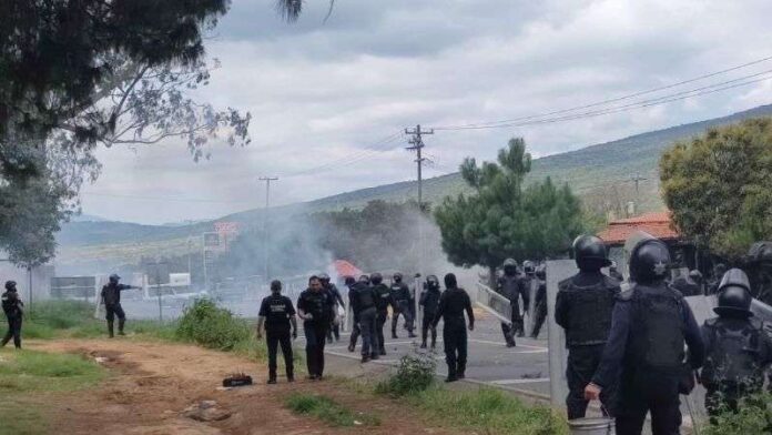 Durante la intervención, los elementos de seguridad arrojaron gases lacrimógenos contra los manifestantes y recibieron piedras, palos y cohetones de parte de éstos.