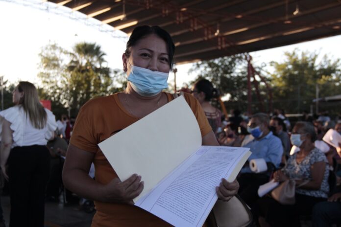Ciudad Juárez, Chihuahua (ADN / Martín Orquiz) – Autoridades federales entregaron escrituras, de forma gratuita, a familias juarenses con el fin de garantizar de forma jurídica la propiedad de sus hogares, en un acto que encabezó el delegado de los Programas para el Bienestar, Juan Carlos Loera de la Rosa.
