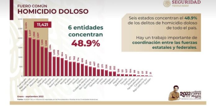 En primer lugar se ubica el estado de Guanajuato, con 2,424 homicidios dolosos, seguido por Baja California, con 2,037; Estado de México, con 1,960, mientras que en cuarto y quinto lugar se ubican Michoacán y Jalisco, con 1,565 y 1,508, respectivamente.