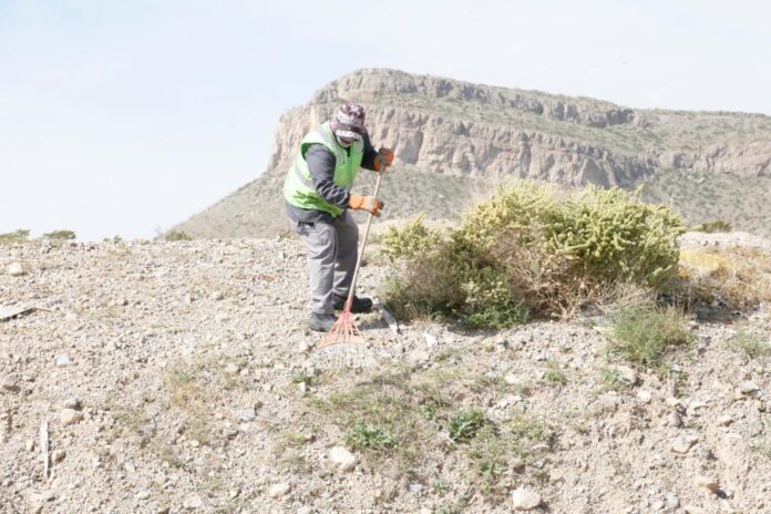 Ciudad Juárez. – Brigadas de la Dirección de Limpia trabajan este día en la limpieza del periférico Camino Real, en un tramo que abarca desde el puente de El Mármol hacia el norte para llegar al circuito de la calle Soles.