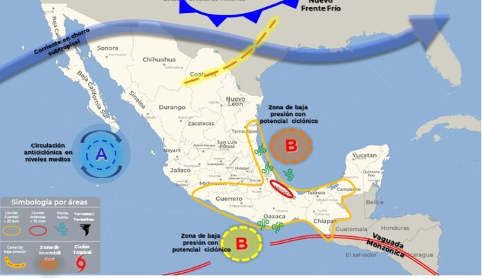 Por otra parte, una circulación anticiclónica en niveles medios de a atmósfera, con centro en el sur de la Península de Baja California, propiciará ambiente estable y sin lluvia en el noroeste, norte y occidente de la República Mexicana.