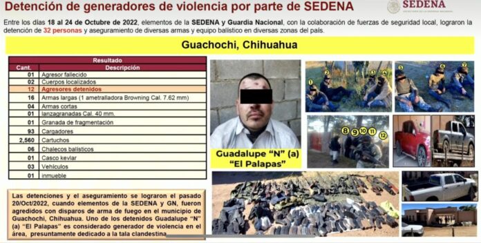 Mejía Berdeja resaltó que tras el enfrentamiento fue capturado Guadalupe “N”, alias “El Palapas”, líder criminal y generador de violencia en el municipio de Guachochi.