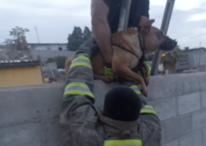 Luego de un reporte ciudadano, los elementos acudieron al lugar y utilizando una escalera de 14 pies y una cuerda, lograron localizar al canino, capturarlo y extraerlo de manera segura, evitando que resultara herido o que su situación empeorara.